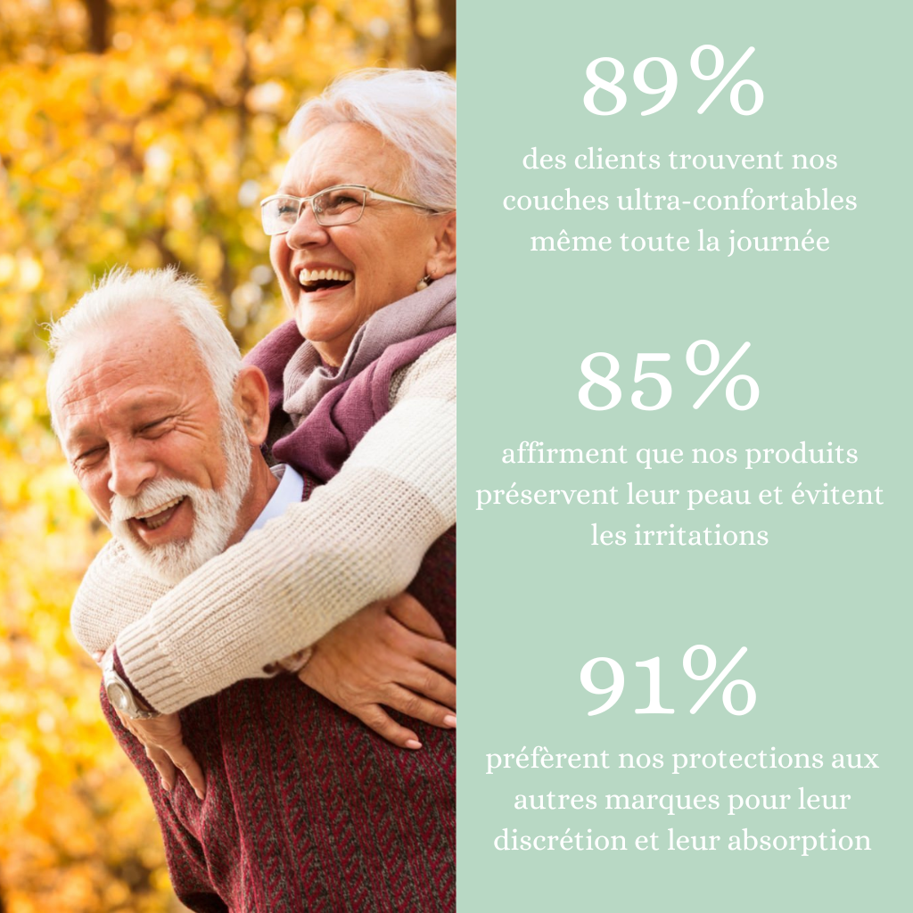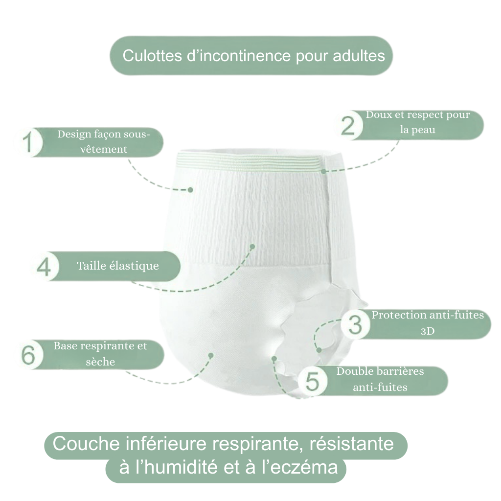 Conçues avec des matériaux de qualité, nos couches combinent confort, discrétion et performance. Chaque caractéristique a été pensée pour répondre aux besoins réels des adultes actifs et des personnes âgées.