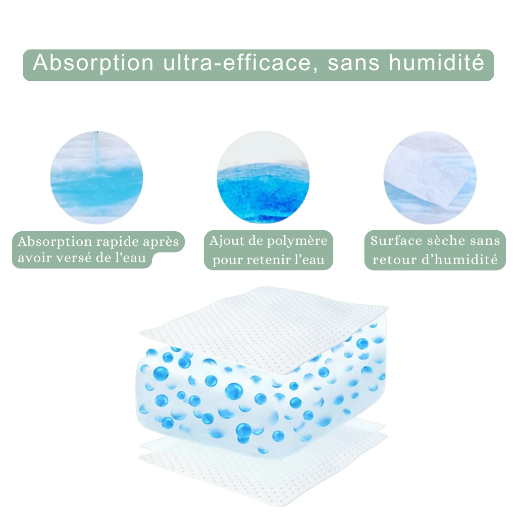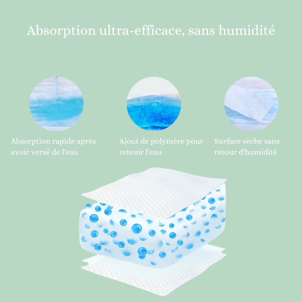 Nos couches sont conçues pour offrir une étanchéité inégalée. Grâce à leur capacité d’absorption de plus de 2 000 ml, vous restez parfaitement au sec, de jour comme de nuit, sans aucune fuite.