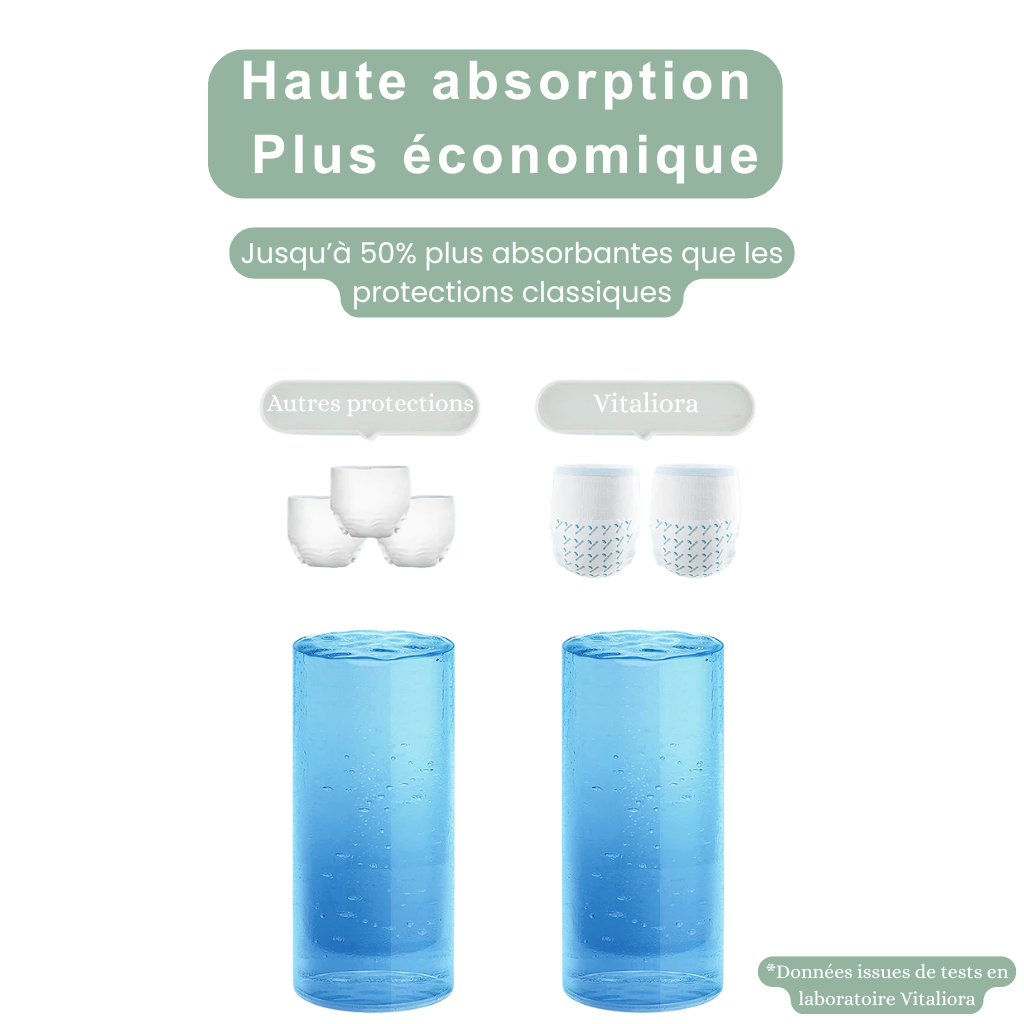 Nos protections offrent jusqu'à 18 heures de protection continue grâce à leur capacité d’absorption de plus de 2000 ml, parfaites pour la journée ou la nuit.